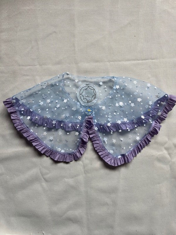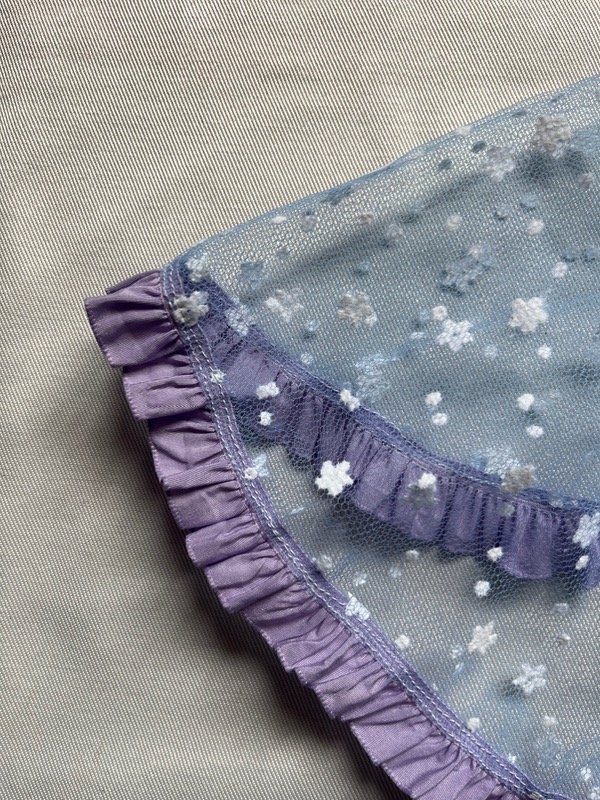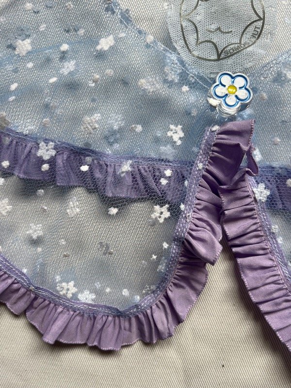 Cuello de tul celeste con flores blancas, volados lilas